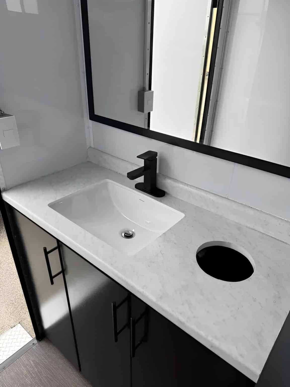 Two Private Restroom Stations – Each with an RV toilet, handwashing sink, and cabinet for storage.